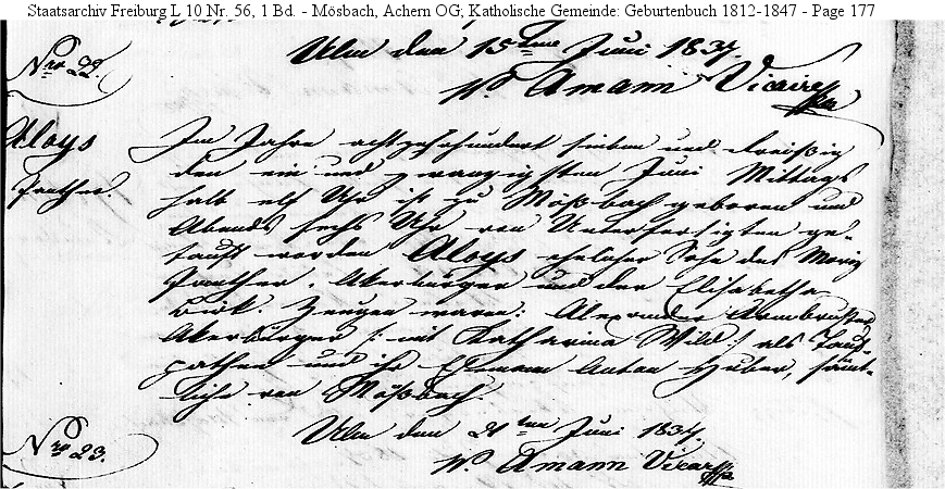 Birth Record - duplikat From Staatsarchiv Freiburg L 10 Nr. 56, 1 Bd. Mösbach, Achern OG; Katholische Gemeinde: Geburtenbuch 1812-1847 Scan 177 |