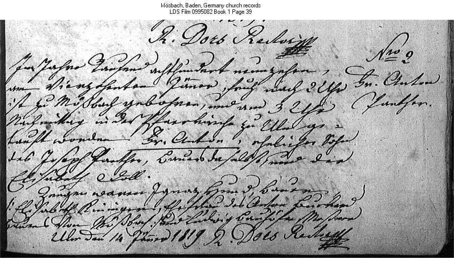 | Birth Record - Original Mösbach, Baden, Germany church records LDS Film 0995082 Book 1 Page 39 |