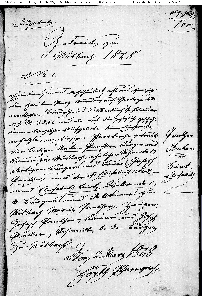 | Marriage Record - Original Mösbach, Baden, Germany church records LDS Film 0995083 Book 1 Page 150 |