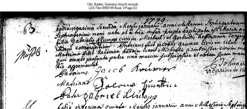 | Birth Record Ulm, Baden, Germany church records LDS Film 0996199 Book 3 Page 63 |