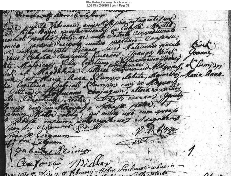 | Marriage Record Ulm, Baden, Germany church records LDS Film 0996361 Book 4 Page 33 |