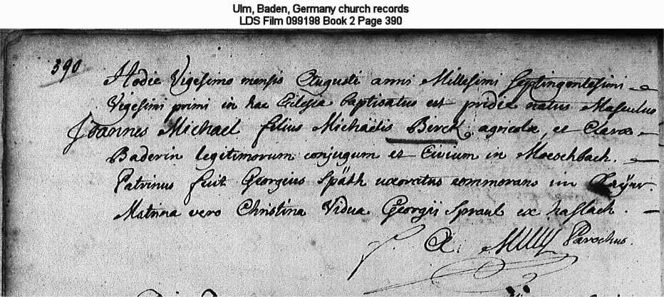 | Probable Birth Record Ulm, Baden, Germany church records LDS Film 0996198 Book 1 Page 390 |