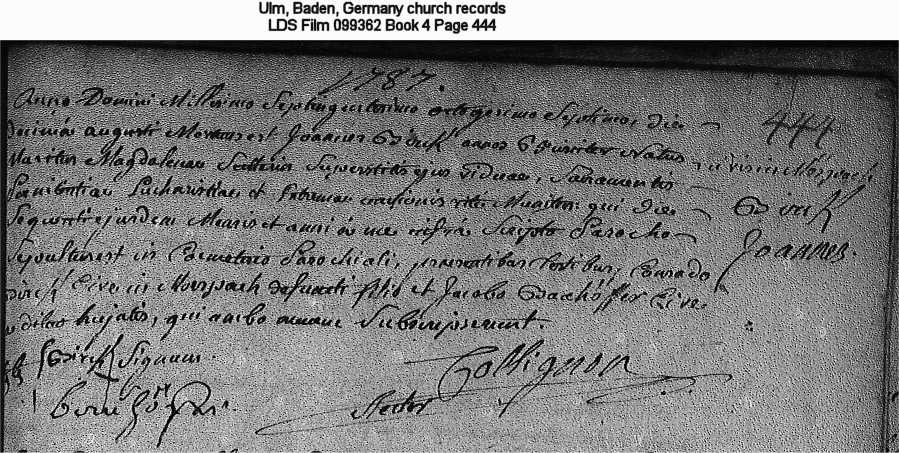 | Death Record Ulm, Baden, Germany church records LDS Film 099362 Book 4 Page 444 |