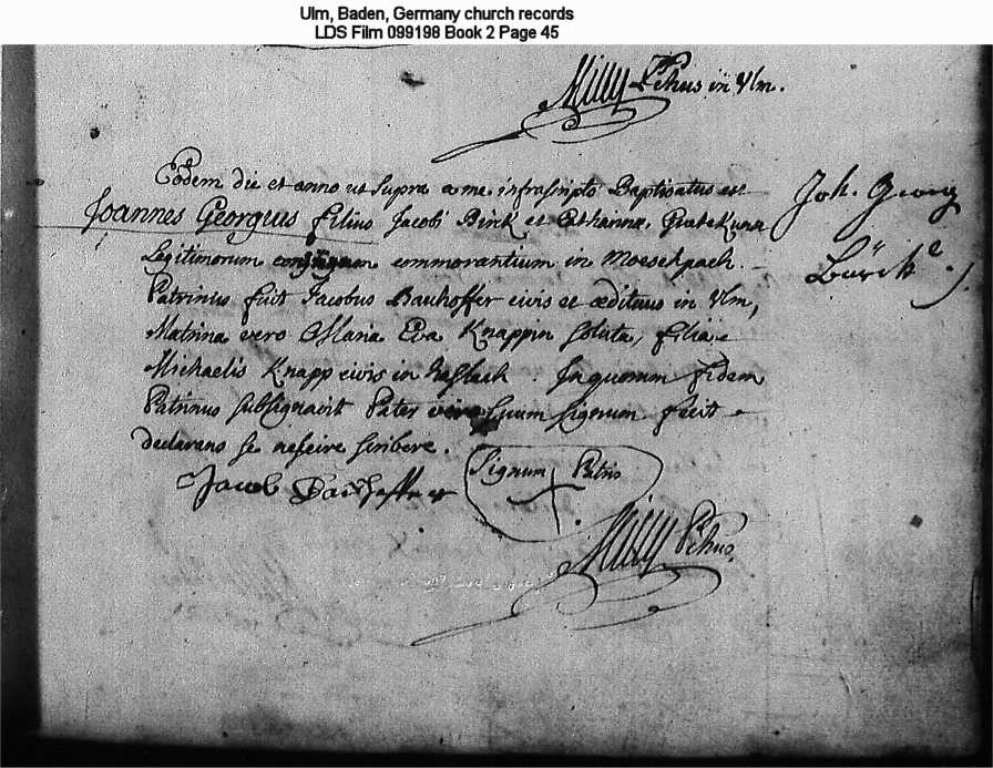 | Possible Birth Record Ulm, Baden, Germany church records LDS Film 099198 Book 2 Page 45 |
