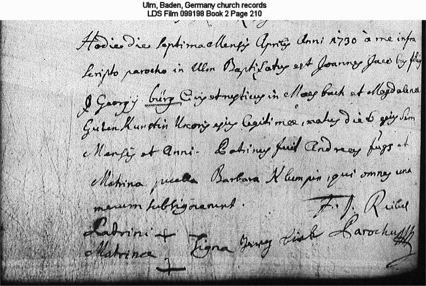 | Possible Birth Record Ulm, Baden, Germany church records LDS Film 099198 Book 2 Page 210 |