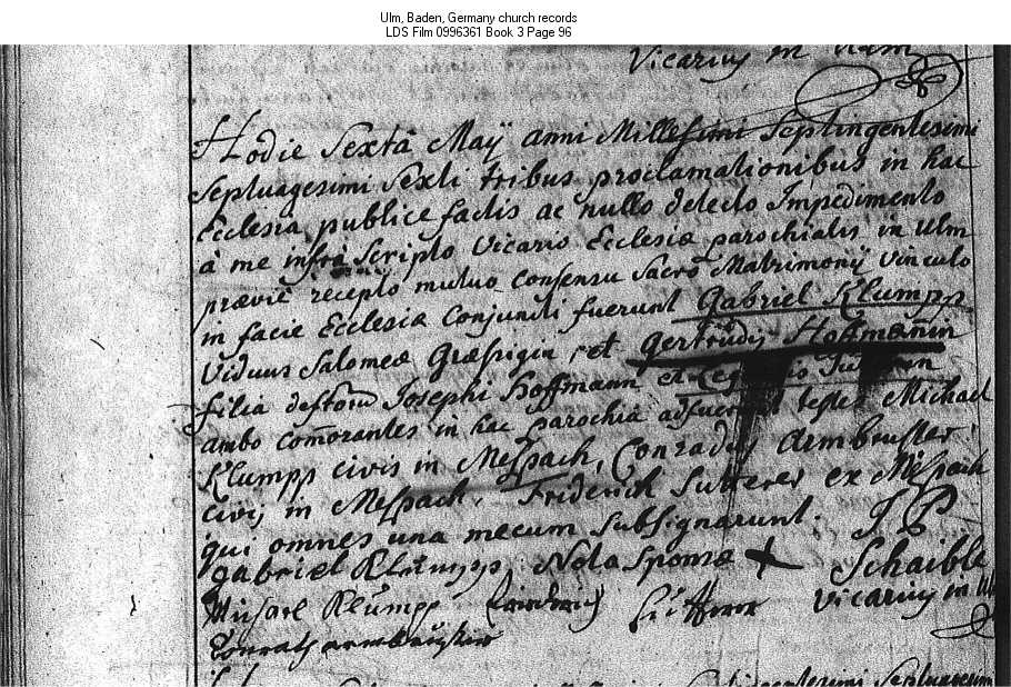 | Marriage Record Ulm, Baden, Germany church records LDS Film 0996361 Book 3 Page 96 |