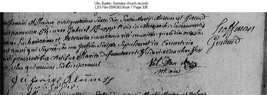 | Death Record Ulm, Baden, Germany church records LDS Film 0996363 Book 1 Page 338 |