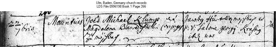 | Birth Record Ulm, Baden, Germany church records LDS Film 0996198 Book 1 Page 266 |