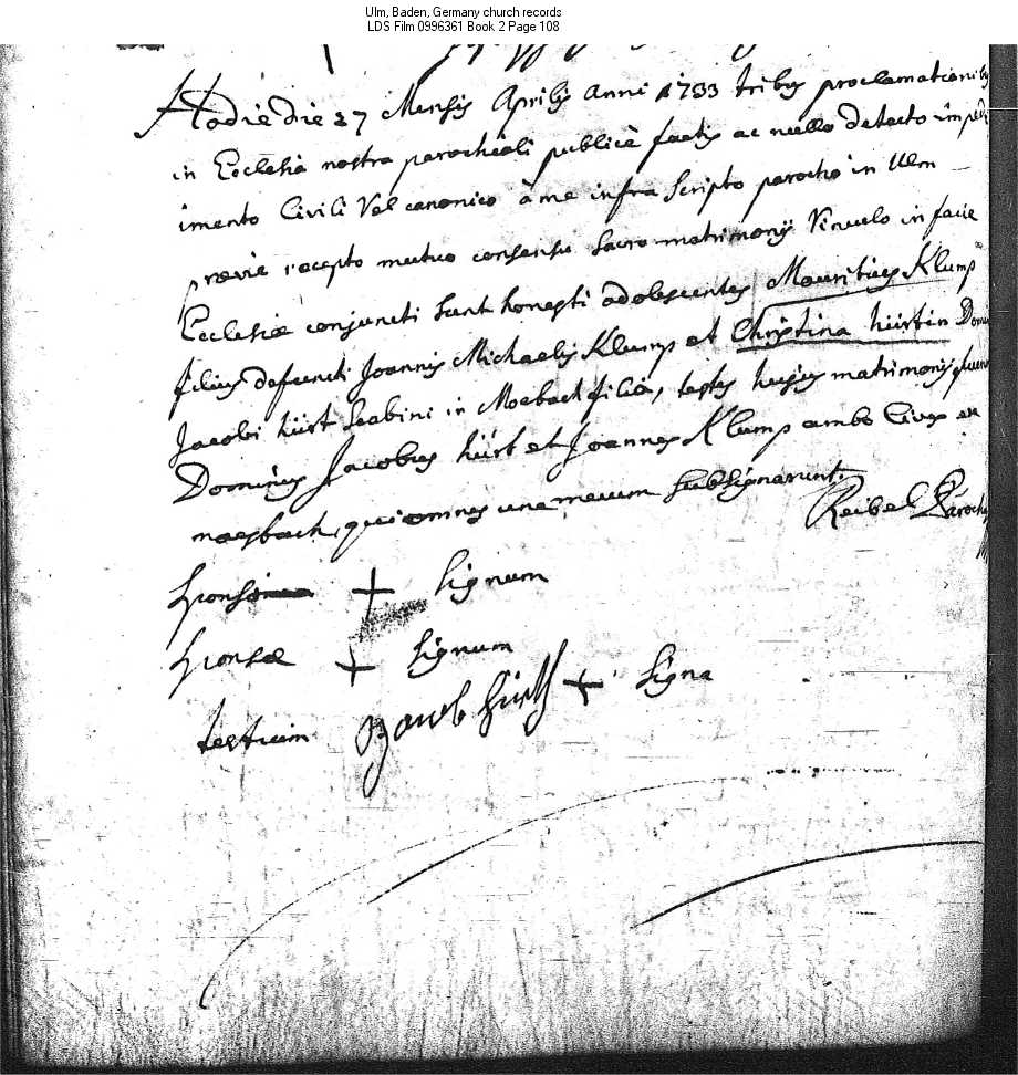 | Marriage Record Ulm, Baden, Germany church records LDS Film 0996361 Book 2 Page 108 |