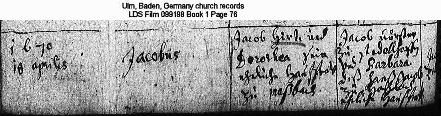 | Birth Record Ulm, Baden, Germany church records LDS Film 099198 Book 1 Page 76 |