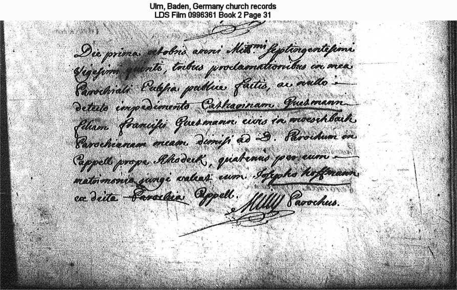 | Marriage Record Ulm, Baden, Germany church records LDS Film 0996361 Book 2 Page 31 |