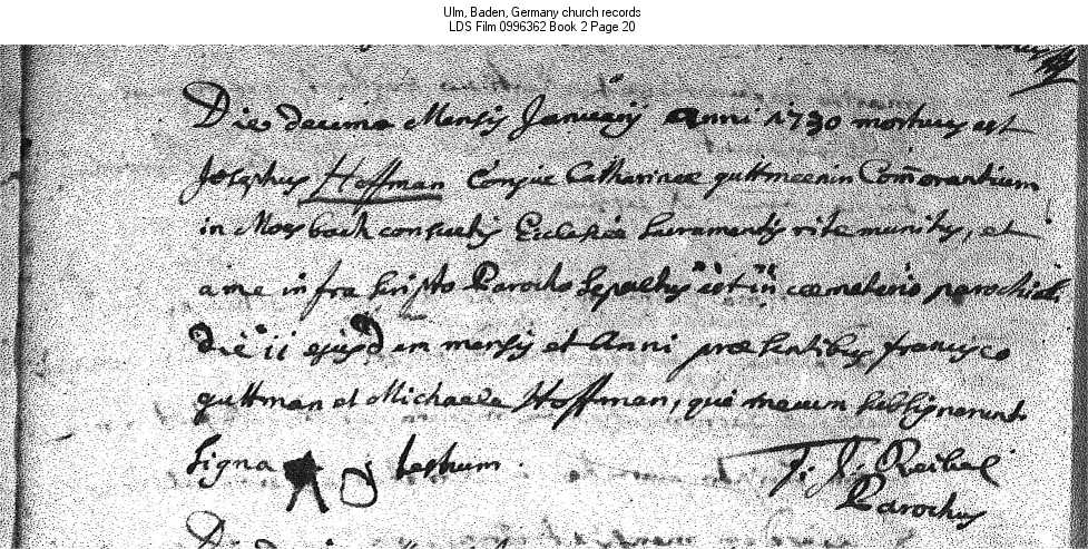| Death Record Ulm, Baden, Germany church records LDS Film 0996362 Book 2 Page 20 |