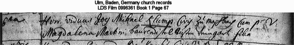 | Marriage Record Ulm, Baden, Germany church records LDS Film 0996361 Book 1 Page 67 |