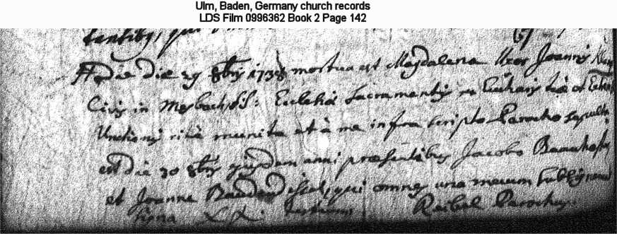 | Possible Death Record Ulm, Baden, Germany church records LDS Film 0996362 Book 2 Page 142 |