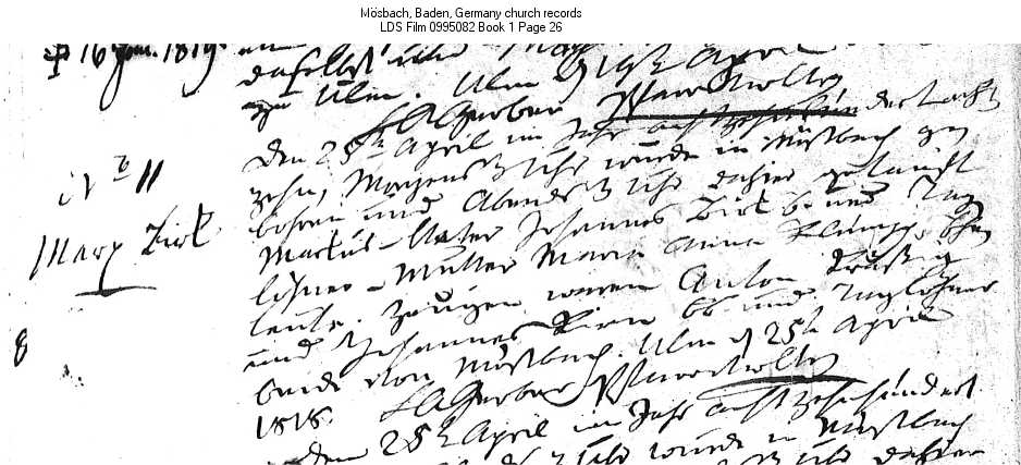 | Birth Record Mösbach, Baden, Germany church records LDS Film 0995082 Book 1 Page 26 Note that you can't make out the name. It appears to be either Mary or Martin Birk |