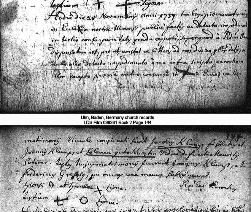 | Marriage Record - Jacob Klumpp Ulm, Baden, Germany church records LDS Film 099361 Book 2 Page 144 |