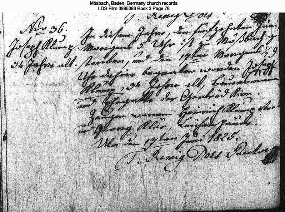 | Death Record Mösbach, Baden, Germany church records LDS Film 0995083 Book 3 Page 76 |