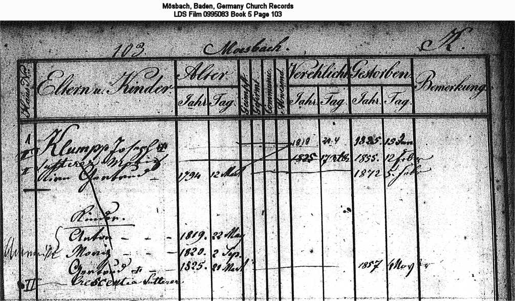| Church Family Record Mösbach, Baden, Germany Church Records LDS Film 0995083 Book 5 Page 103 |