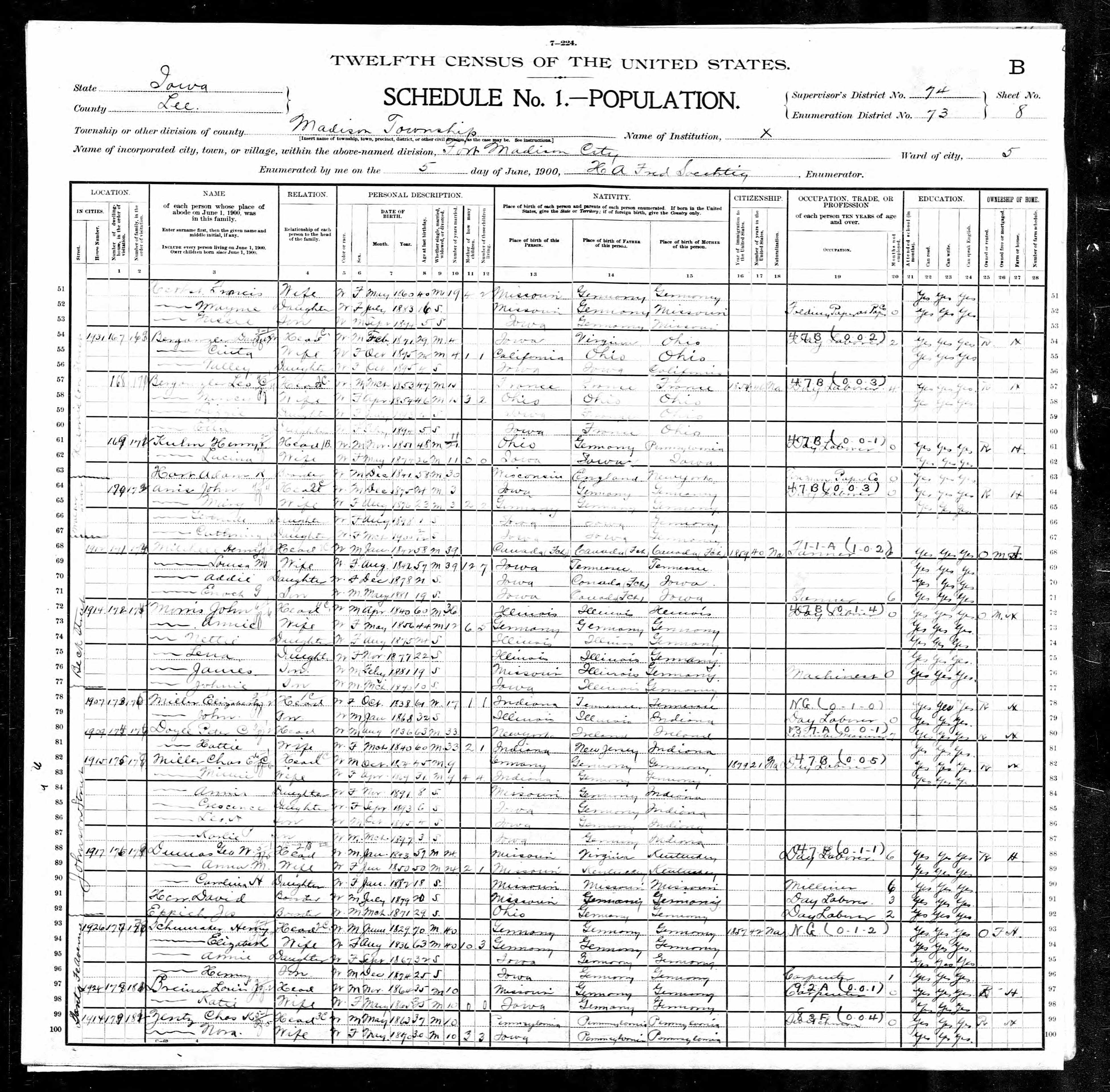 | 1900 US Federal Census Source Citation Year: 1900; Census Place: Madison, Lee, Iowa; Roll: 442; Page: 8B; Enumeration District: 0073; FHL microfilm: 1240442 Description: Enumeration District : 0073; Description: Fort Madison City, Ward 5 |