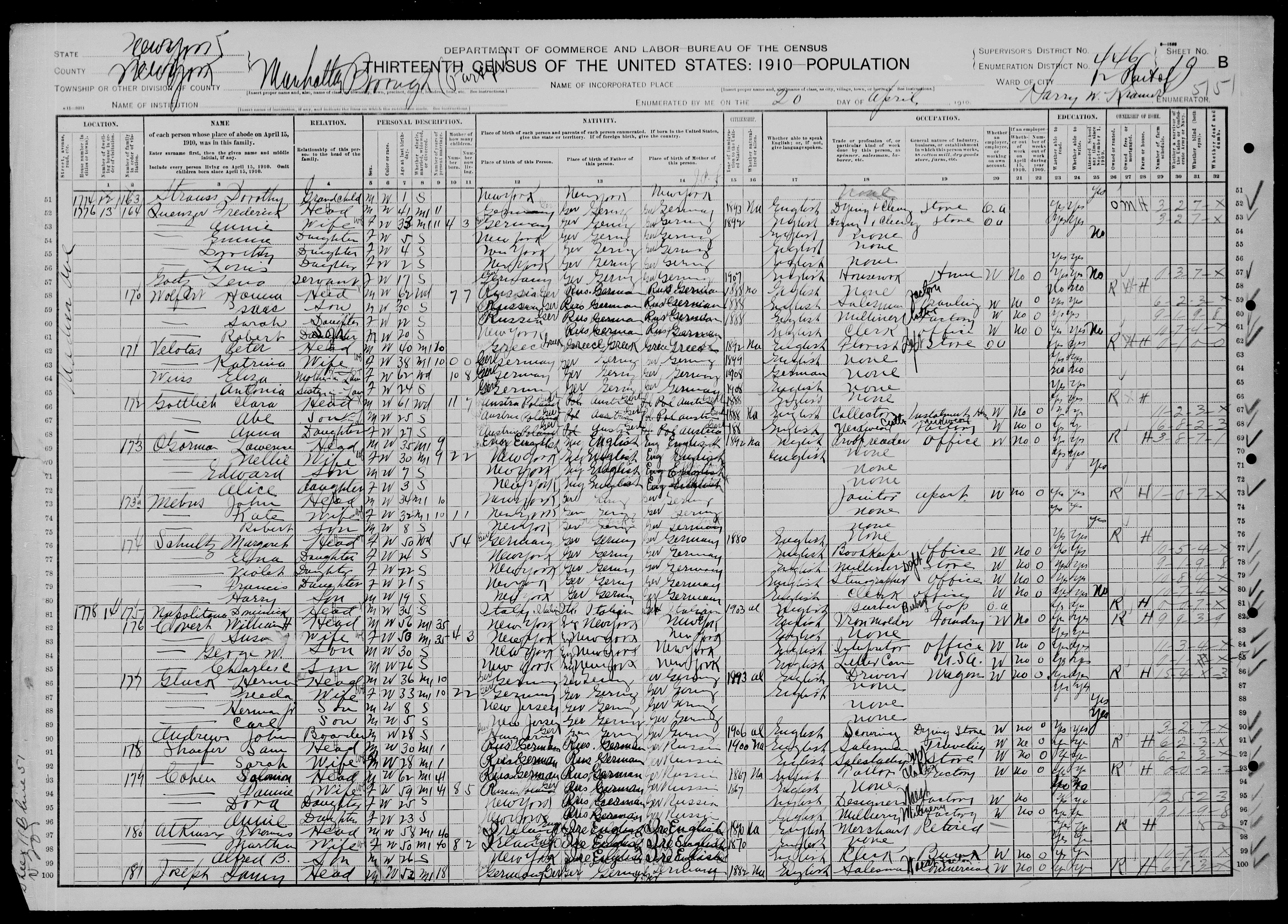 | 1910 US Federal Census "United States Census, 1910," database with images, FamilySearch (https://familysearch.org/pal:/MM9.3.1/TH-1951-23056-13479-86?cc=1727033 : accessed 6 May 2016), New York > New York > Manhattan Ward 12 > ED 446 > image 20 of 38; citing NARA |