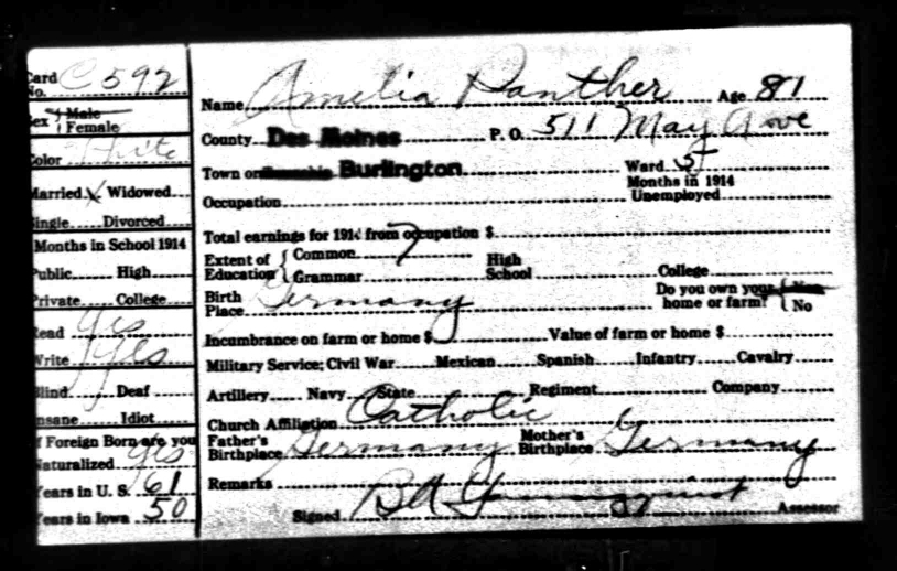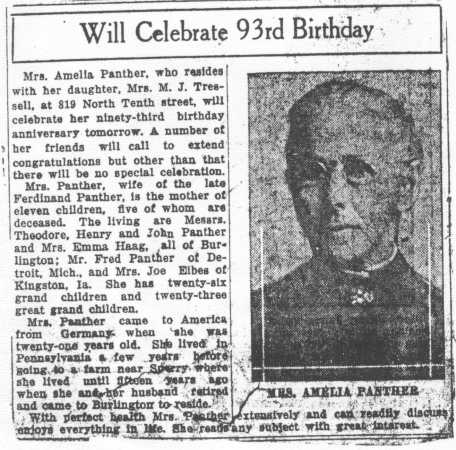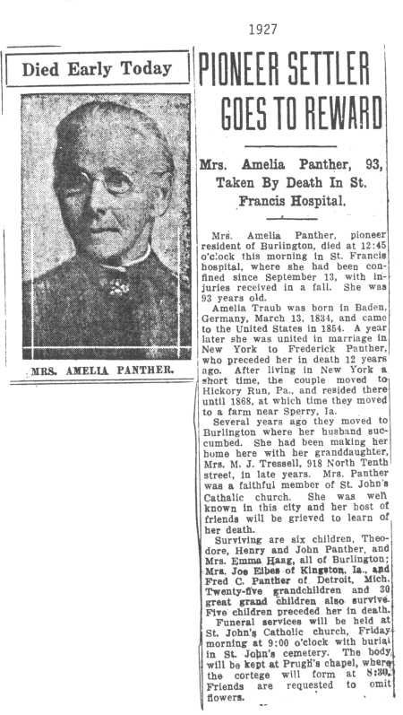 | Obituary Note her obit lists her husband's name as Frederick Panther. |