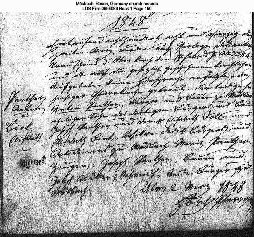 | Anton Panther Marriage Record - Original Mösbach, Baden, Germany church records LDS Film 0995083 Book 1 Page 150 |