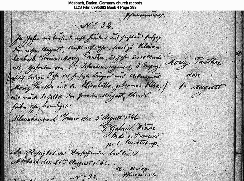 | Death Record - Original Mösbach, Baden, Germany church records LDS Film 0995083 Book 4 Page 289 |