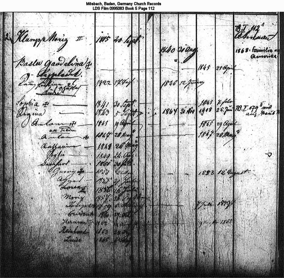 | Church Family Record Mösbach, Baden, Germany Church Records LDS Film 0995083 Book 5 Page 112 |