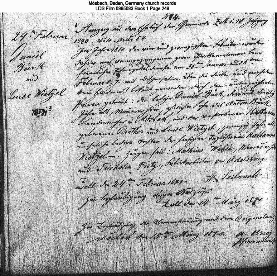 | Birth Record Mösbach, Baden Church Records LDS Film 0995082 Book 1, Pages 249-250 |