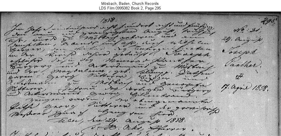| Birth Record Mösbach, Baden, Church Records LDS Film 0995082 Book 2, Page 295 |