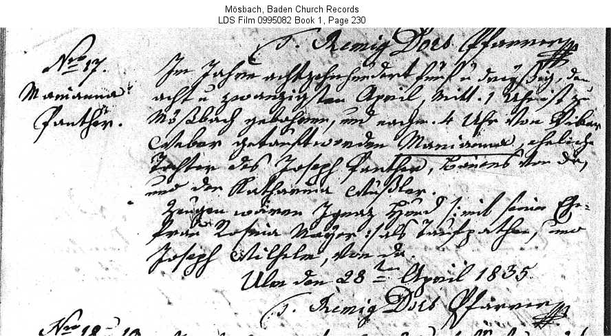 | Birth Record Mösbach, Baden Church Records LDS Film 0995082 Book 1, Page 230 |