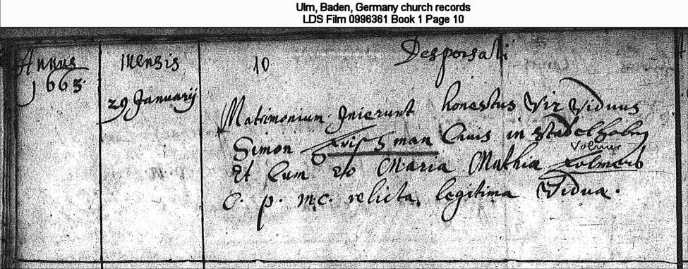 | Marriage Record - Maria Volmer Ulm, Baden, Germany church records LDS Film 0996361 Book 1 Page 10 |