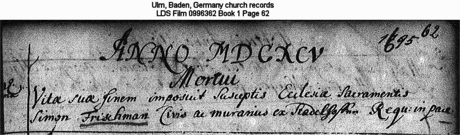 | Death Record Ulm, Baden, Germany church records LDS Film 0996362 Book 1 Page 62 Lists him as a "murarius" which appears to be a wall builder or wall painter. |