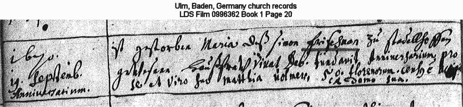 | Death Record Ulm, Baden, Germany church records LDS Film 0996362 Book 1 Page 20 Looks to note the anniversary of the death of Maria, born to Simon Frischmann but is an anniversary noted by Mathias Volmer. |