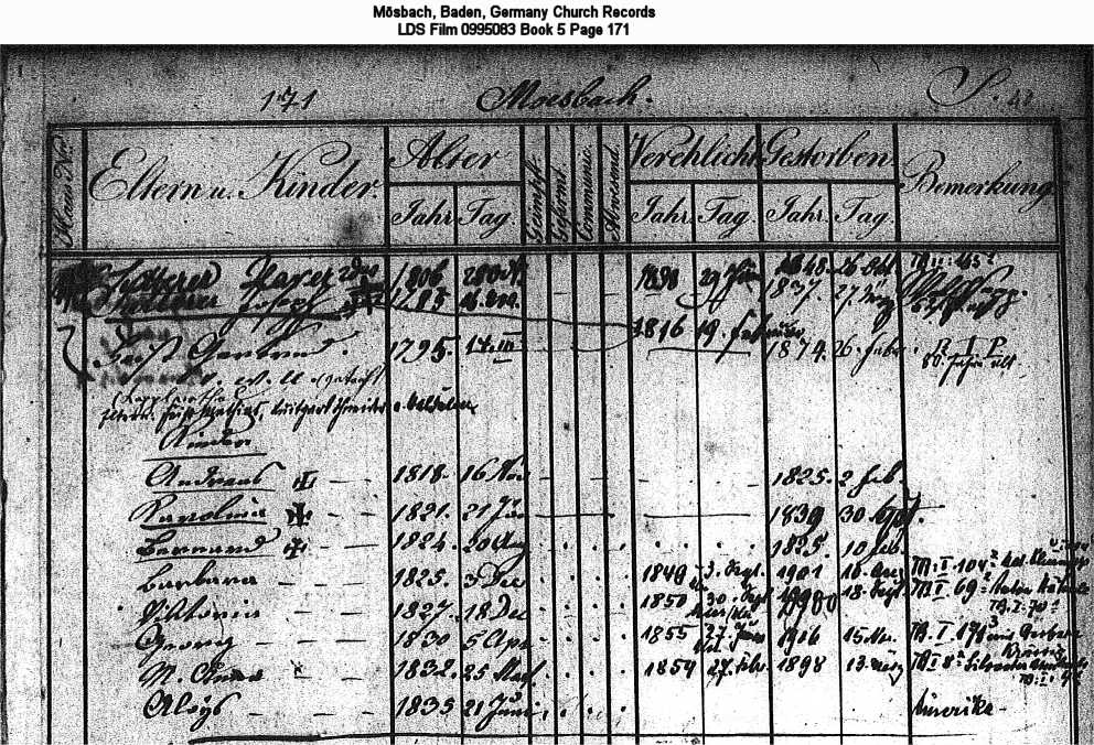 | Church Family Record Mösbach, Baden, Germany Church Records LDS Film 0995083 Book 5 Page 171 |