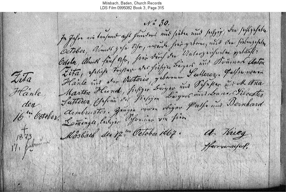 | Birth Record Mösbach, Baden, Church Records LDS Film 0995082 Book 3, Page 315 |