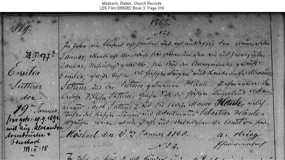 | Birth Record Mösbach, Baden, Church Records LDS Film 0995082 Book 3, Page 319 |