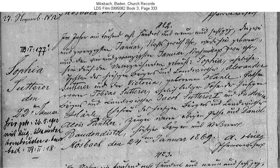 | Birth Record Mösbach, Baden, Church Records LDS Film 0995082 Book 3, Page 333 |