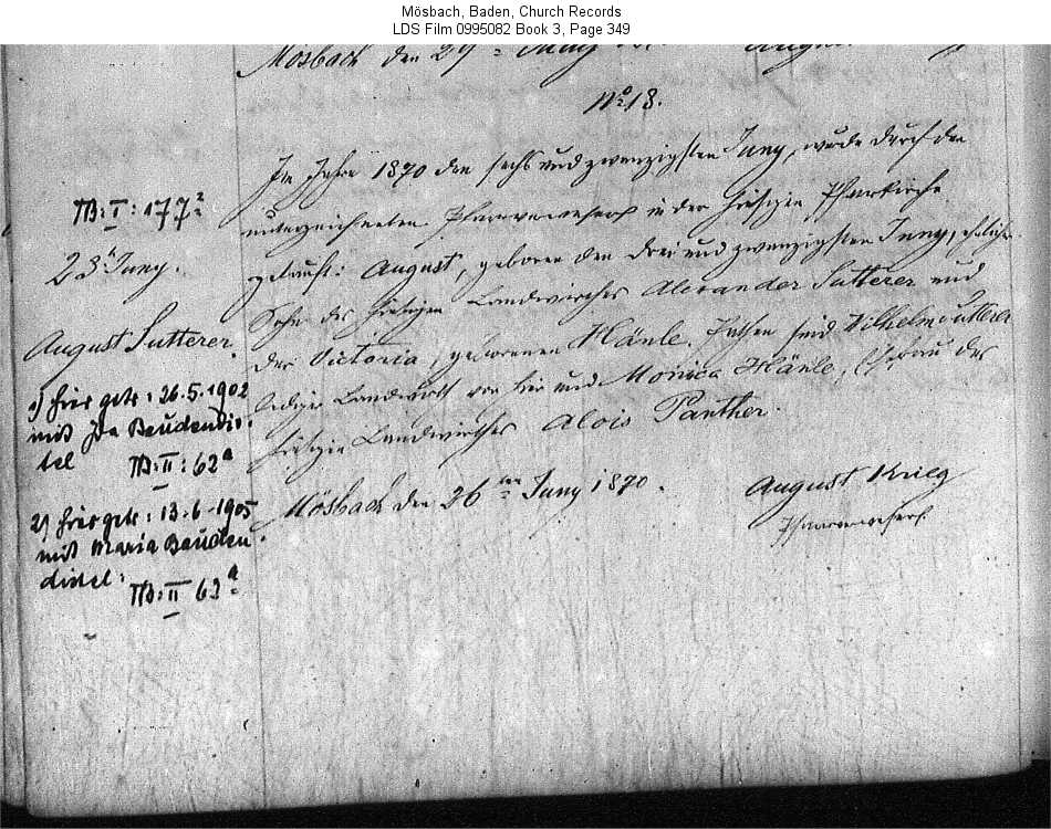 | Birth Record Mösbach, Baden, Church Records LDS Film 0995082 Book 3, Page 349 |