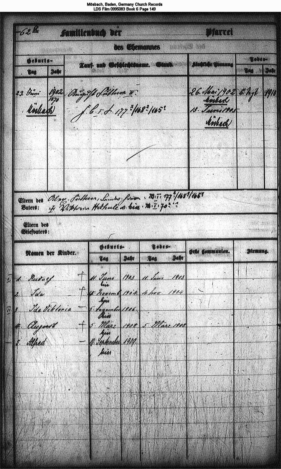| Church Family Record 2 page 1 Mösbach, Baden, Germany Church Records LDS Film 0995083 Book 6 Page 149 |