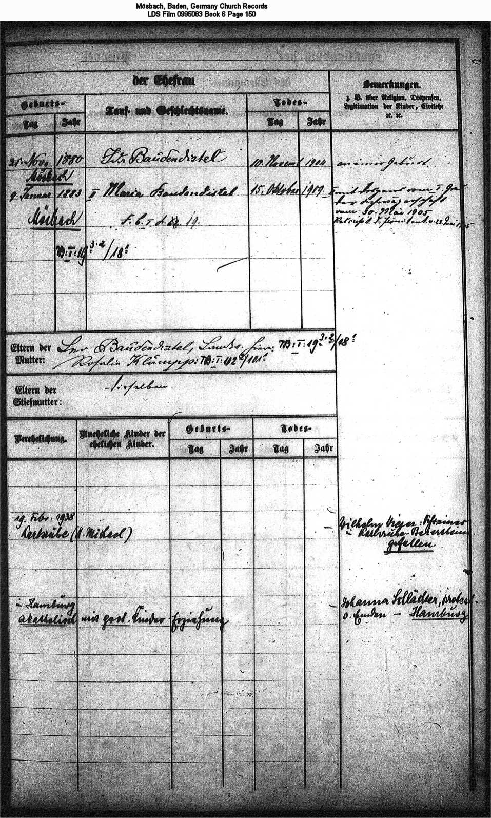 | Church Family Record 2 page 2 Mösbach, Baden, Germany Church Records LDS Film 0995083 Book 6 Page 150 |