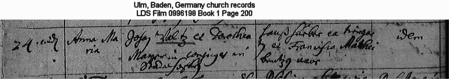 | Birth Record Ulm, Baden, Germany church records LDS Film 0996198 Book 1 Page 200 |