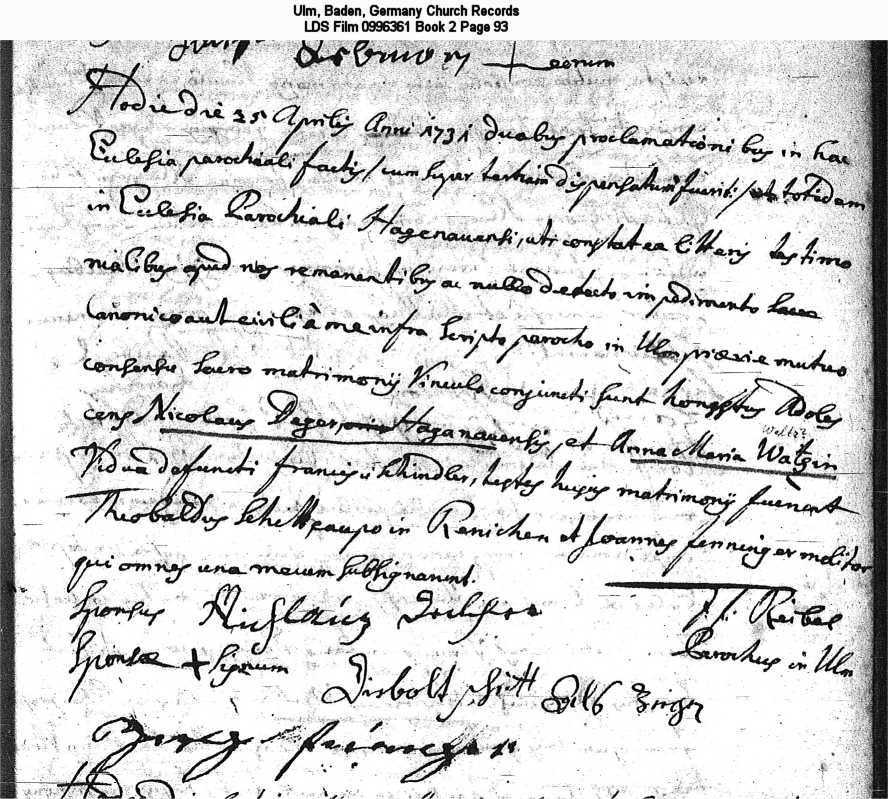 | Marriage Record to Nicolaus Hagenauen Ulm, Baden, Germany Church Records LDS Film 0996361 Book 2 Page 93 |