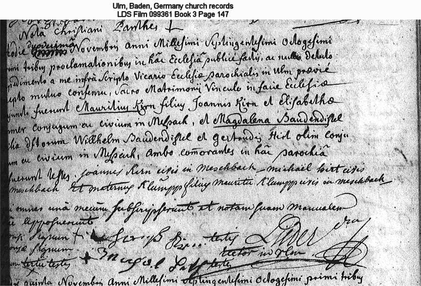 | Marriage Record Ulm, Baden, Germany church records LDS Film 099361 Book 3 Page 147 |