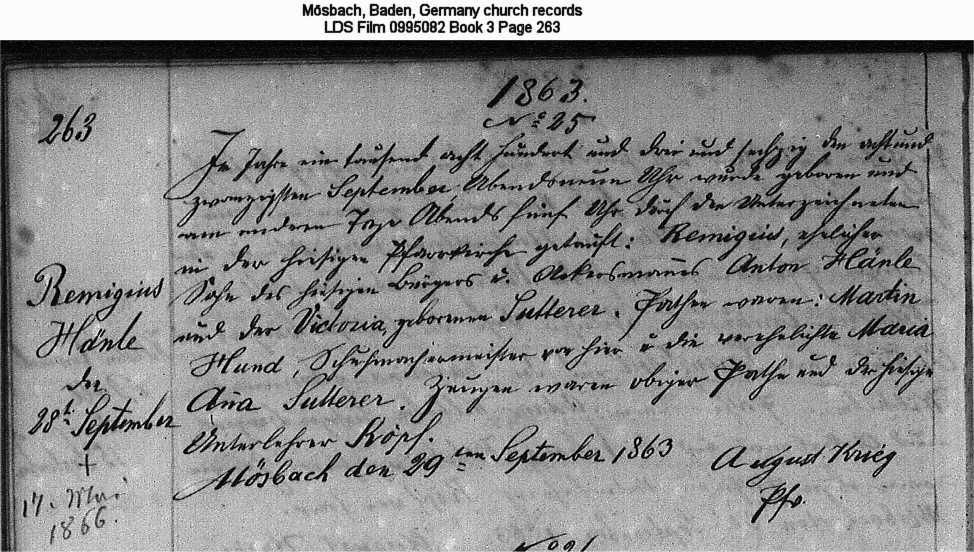 | Birth Record Mösbach, Baden, Germany church records LDS Film 0995082 Book 3 Page 263 |