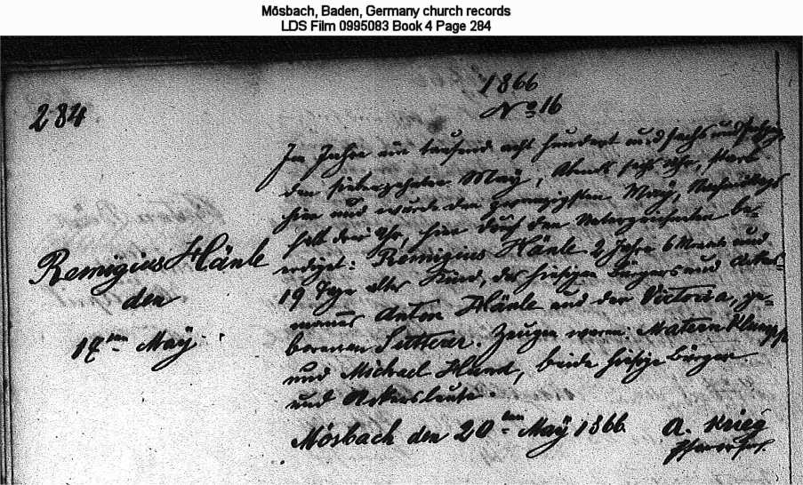 | Death Record Mösbach, Baden, Germany church records LDS Film 0995083 Book 4 Page 284 |