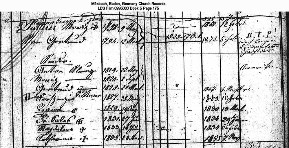 | Church Family Record 3 Mösbach, Baden, Germany Church Records LDS Film 0995083 Book 5 Page 175 |