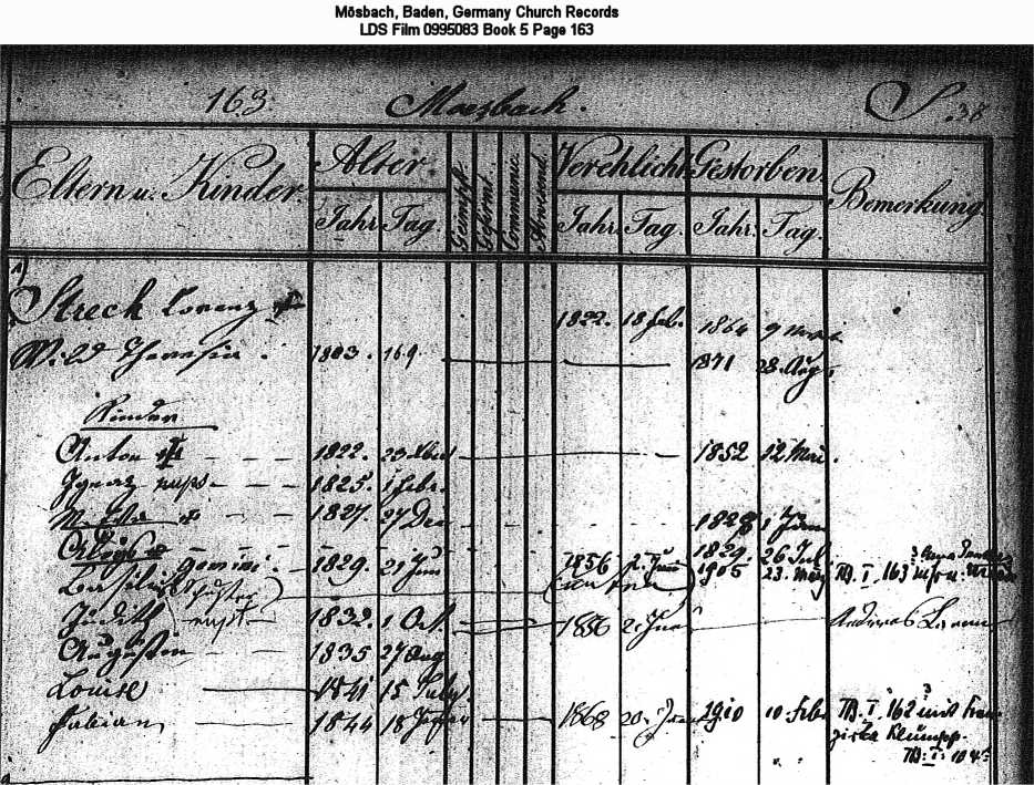 | Church Family Record 2 Mösbach, Baden, Germany Church Records LDS Film 0995083 Book 5 Page 163 |