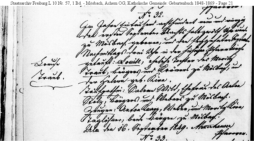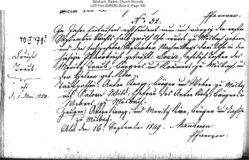 | Birth Record - Original Mösbach, Baden, Church Records LDS Film 0995082 Book 2, Page 166 |