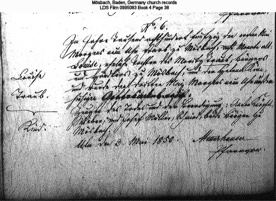 | Death Record Mösbach, Baden, Germany church records LDS Film 0995083 Book 4 Page 38 |